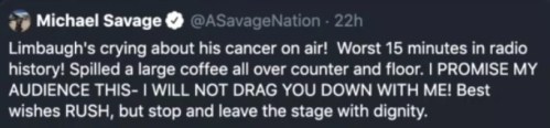 RUSH: Basically, Savage was suggesting that Limbaugh should go off somewhere now and die quietly instead of sharing his journey with his millions of loyal radio listeners. What a jerk.