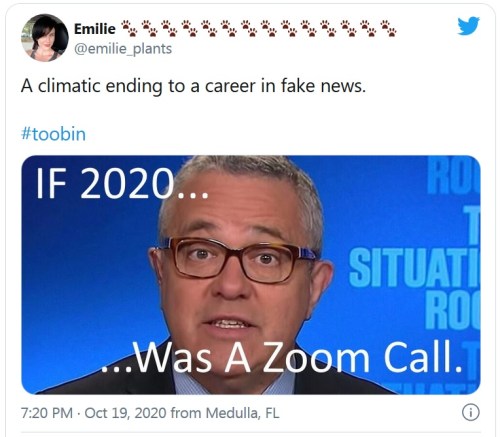 Brian “Dumbest Man on Television” Stelter reported for the “Most Trusted Name in News” that “Jeffrey Toobin has been sidelined at a pivotal moment in the run-up to the presidential election. The reason: He exposed himself during a Zoom call with New Yorker colleagues in what he says was an accident.”