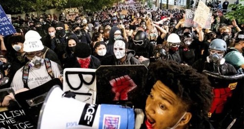 BLACK BLOC: I didn’t know there was a name for this – “A black bloc is a tactic used by protesters who wear black clothing, ski masks, scarves, sunglasses, motorcycle helmets with padding, or other face-concealing and face-protecting items. The clothing is used to conceal wearers’ identities and hinder criminal prosecution by making it difficult to distinguish between participants. It is also used to protect their faces and eyes from pepper spray, which is used by police during protests or civil unrest. The tactic allows the group to appear as one large unified mass. Black bloc participants are often associated with anarchism, anarcho-communism, communism, libertarian socialism, antifascism, or the anti-globalization movement.”