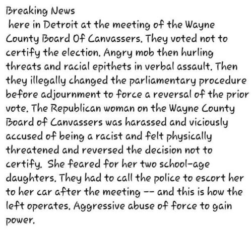 MICHIGAN: Wayne County – Gulag-type target lists. Law firms threatened and forced to quit. County officials doxed, intimidated, and threatened unless they change their votes. This unity thing is going well.