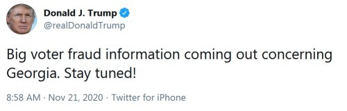 GEORGIA: Third recount coming up – “President Trump and his campaign continue to insist on an honest recount in Georgia, which has to include signature matching and other vital safeguards. Without signature matching, this recount would be a sham and again allow for illegal votes to be counted,” the statement continued. “If there is no signature matching, this would be as phony as the initial vote count and recount. Let’s stop giving the People false results. There must be a time when we stop counting illegal ballots. Hopefully it is coming soon.” – Trump campaign