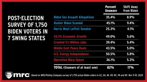 ■ Burying Biden’s Bad News: The media’s censorship of Biden’s scandals had the strongest impact on this year’s election. According to our survey, more than one-third of Biden voters (35.4%) were unaware of the serious allegations brought against the Democratic nominee by Tara Reade, a former staffer who said Biden sexually assaulted her in the 1990s.