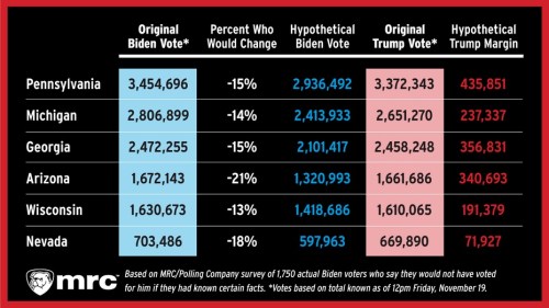 In Georgia, 15% of Biden’s voters say they would have defected based on full information, taking 370,838 votes out of his column, and putting Trump comfortably ahead. In Arizona, 21% say they would have changed their vote, deducting 351,150 from Biden’s column and putting Trump in front there, too.
