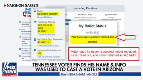 ARIZONA: Nahshon Garrett, an aspiring Olympic wrestler, moved from Arizona to Tennessee this year to train. He voted in Tennessee. When he found out he had supposedly voted in Arizona, he looked up his name on the state’s ballot tracker and found that the ballot he never requested, filled out, signed, or returned had not only been counted, but signature verified!