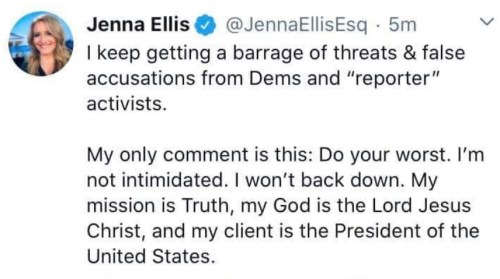 JENNA ELLIS: President Donald Trump’s lawyer Jenna Ellis said she’s received “hundreds” of threats, including anonymous phone calls, in recent days. One said she deserves to be raped.