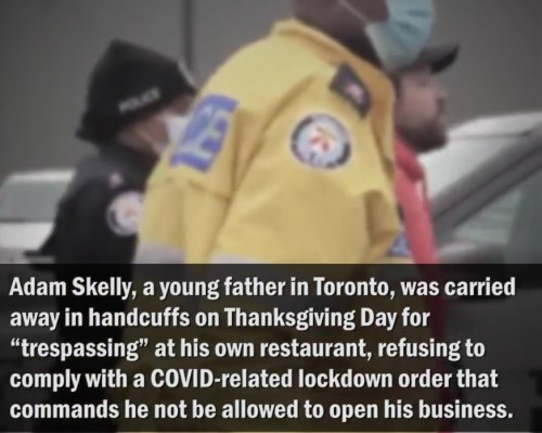 CANADA: CLICK https://www.facebook.com/aklavan/videos/133775264997217 [3:08] to see a news report about one of the growing number of small business owners who are saying Hell No to government jackboots.