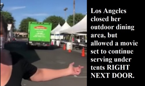NBC: Over the weekend, a video of Angela Marsden, the owner of the Pineapple Hill Saloon & Grill of Los Angeles, protesting the city shutting down outdoor dining with no scientific basis went viral. The video showed Marsden’s emotional plea for help as she exposed how a similar set of tents and tables were set up in the same parking lot to cater a film production approved by the city.