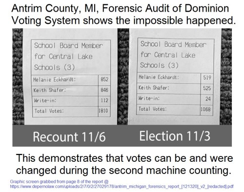 DOMINION AUDIT: The security group that performed a forensic audit of the Antrim County Nov 2020 election results has issued its report. (See pdf below.) The purpose of the audit was to test the security of the Dominion Voting System. Their conclusion is that the election results for Antrim County should not be certified.