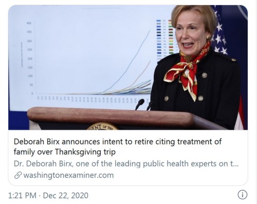 - https://twitchy.com/samj-3930/2020/12/22/boo-hoo-dr-deborah-birx-to-retire-in-near-future-blaming-treatment-of-her-family-after-she-traveled-for-thanksgiving/