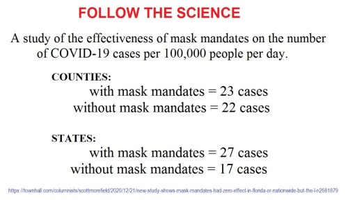 MASKS: A study of coronavirus cases in counties with mask-mandates vs. those without them found no statistically significant difference. In fact, counties with mask-mandates did slightly worse than those that refused to jackboot the citizenry. A comparison of coronavirus cases in states had even worse results.