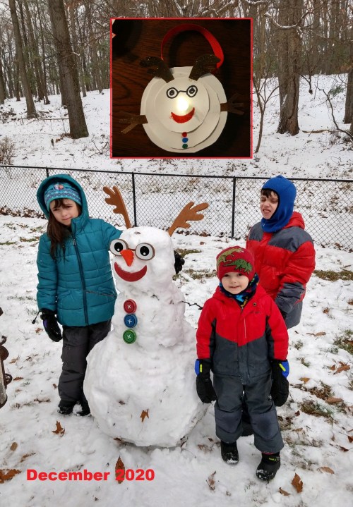 It was such a special day that Mama Buzz made an ornament for their tree to commemorate it. The nose on the ornament is a battery-powered tea light. The features and buttons etc. on the real snowman are painted wood. They’re from a snowman kit somebody got them years ago.