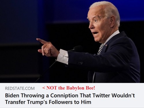 BIDEN: Joe Biden, who had difficulty having anyone come to any of his events, is reportedly very upset that Twitter is wiping out all of Trump’s followers before turning over the @POTUS (33 million Trump followers) and @WhiteHouse (26 million Trump followers). Many Trump followers said it didn’t much matter, since they planned to unfollow anyway.