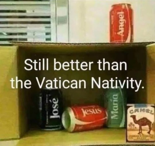 ART: The main difference between this and the Vatican Nativity is that this is very successful at being a tongue-in-cheek meme while the Vatican Nativity is a total failure at being an uplifting and inspirational piece of major religious art.