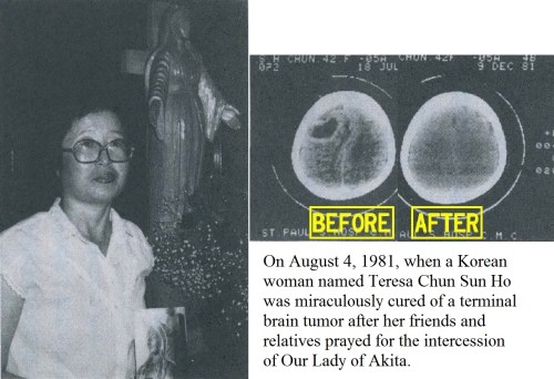 Teresa Chun Sun Ho was comatose and dying when she received a vision of Our Lady of Akita. Then, she woke up, completely cured. Even untrained eyes can see the astonishing difference in her brain x-rays.