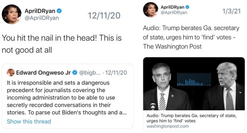 MEDIA MALPRACTICE: White House correspondent April Ryan thinks secret audio recordings of Biden set a dangerous precent, but secret audio recordings of Trump are news. Example 1,789,567 of why the national media had zero credibility. Double standards as far as eye can see.