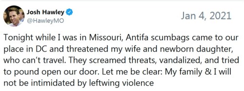 - https://www.bizpacreview.com/2021/01/05/sen-josh-hawley-rips-antifa-scumbags-he-says-threatened-wife-and-newborn-home-alone-in-d-c-1012679/
