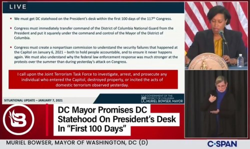 DC: CLICK https://www.facebook.com/whitehousebrief/videos/453448772700223 [3:13] to hear DC Mayor Bowser’s demands for the 117th Congress under the incoming Biden/Harris administration.