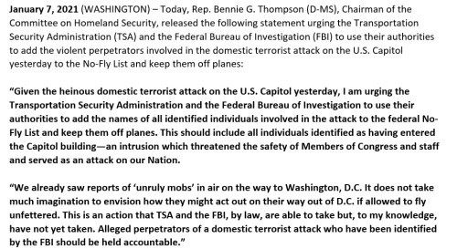 NO FLY LIST: The House Homeland Security Committee is asking the FBI and the TSA to add Americans who peacefully protested in DC to their no-fly list. The reason cited is the “heinous acts of domestic terror” that was supposedly perpetrated by Trump supporters.