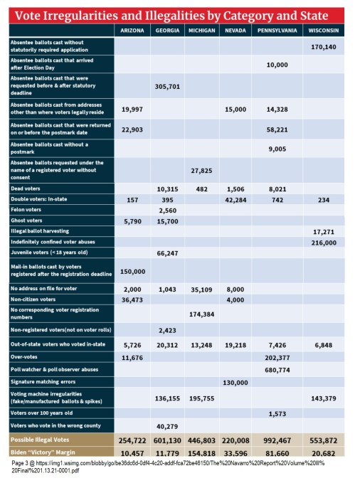 “The broader goal of this final installment of the Navarro Report is to provide investigators with awell-documented tally of potentially illegal votes on a state-by-state and category-by-category basis. This tally is presented in Figure One.” [Graphic below.]