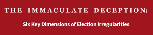 “Volume 1 of the Navarro Report, The Immaculate Deception, assessed the fairness and integrity of the 2020 Presidential Election by identifying and assessing six key dimensions of alleged election irregularities. These irregularities included: outright fraud, ballot mishandling, a wide range of process fouls, multiple violations of the 14th Amendment’s Equal Protection Clause, voting machine irregularities, and statistical anomalies.”