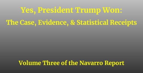 “Volume 3 of the Navarro Report is designed to serve as a capstone to what has been a comprehensive analysis of the question: Was the 2020 presidential election stolen from Donald J. Trump? In this report, we provide the most up-to-date statistical ‘receipts’ with respect to the potential number of illegal votes in each battleground state.