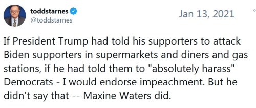 “Where’s the accountability for the left after encouraging and normalizing violence? Rather than helping American people in this time, we start impeachments that further divide our country. I call bull-crap.”