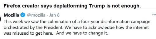 FIREFOX: Mitchell Baker, Executive Chairwoman and CEO of Mozilla, posted a blog entitled, “We need more than deplatforming,” in which he blames Trump for the “siege and take-over of the U.S. Capitol” (which didn’t happen) and says that simply removing social media accounts does not go far enough in stunting “white supremacy” online.