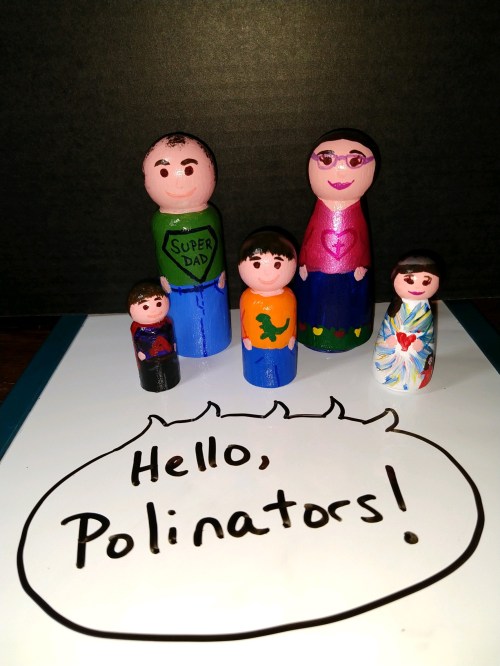 GRAMMY NOTES: Mama Buzz bought about a bazillion blank wooden peg dolls and has been having a lot of fun making saints. This week, she added a Mascot family! Each member of Casa Buzz chose his/her own outfit for her to paint. Then, she took pics, with this special one just for all y’all. She never forgets the garden! When she’s taking pics of the kids, she deliberately takes some where their faces aren’t showing so I’ll have some Mascot material. 🙂