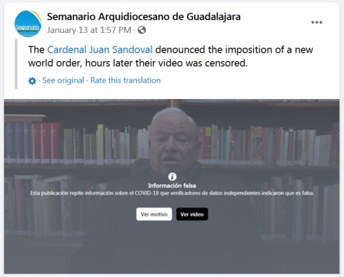 CENSORSHIP: Facebook has censored a video of Mexican Cardinal Juan Sandoval Íñiguez for suggesting that globalist leaders are exploiting the coronavirus pandemic to bring about a new world order.
