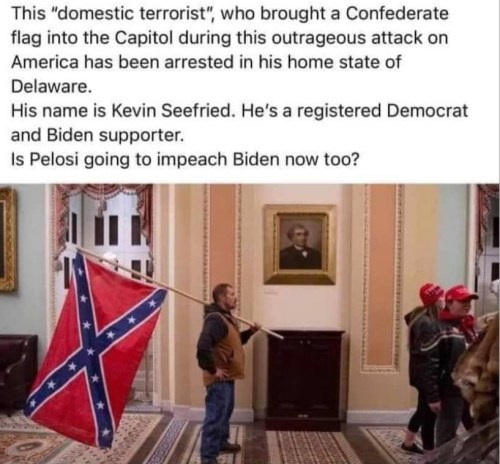 Kevin Siefried, who was photographed carrying the Conferate flag, is a registered Democrat. I tried searching “kevin seifried delaware” at Facebook and got “We’re temporarily hiding some results for this search query.” Let me guess why …
