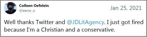 CANCEL CULTURE: When somebody outed Colleen Oefelein as having joined Parler and Gab, The Jennifer De Chiara Literary Agency fired her.