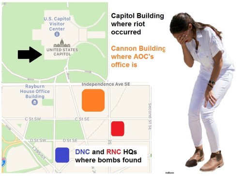 Reality check … AOC was in her office during the riot. Her office is in the Cannon Building which folks who know the area say is a six minute walk away from the Capitol Building. See map. The closest she got to the violence was when a cop stopped by her office to do a welfare check.