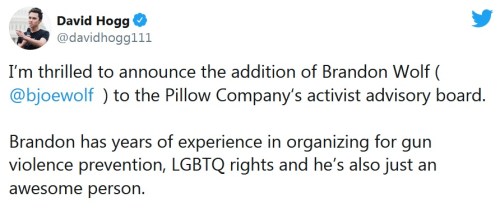 HOGG: Gun control activist David Hogg (20) has announced he is going into the pillow business so that his besties on the left will have a leftie purist alternative to MyPillow for all their pillow needs.