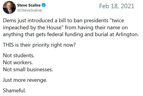 TDS: In late January, a bunch of House Democrats proposed a bill they call the “No Glory for Hate Act.” It’s official name is H.R. 484. It’s purpose is to “prohibit the use of Federal funds for the commemoration of certain former Presidents” by which they mean presidents who have been impeached twice, which duh means it is legislation targeted specifically at a single former president named Donald Trump.