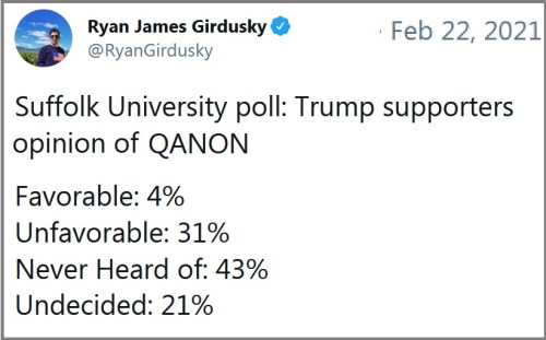 QANON: Before I listened to the Tucker piece above, I was in the Never Heard of It (43%). Now I’m in the Undecided [21%] because, while I’ve now heard of it, I still have no idea what it really is. Or is not.