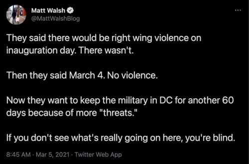 “We didn’t see a single person insurrecting at the Capitol today — or for that matter, anywhere else in the country. Shocked? Don’t be. It was just another lie, not so different from when they told us we’d need troops to protect Joe Biden’s inauguration. Then they said we’d need soldiers to keep ‘QAnon’ away from the impeachment trial. Then there was today’s hysteria. Next, there will be something else. … Wokeness is what you when you are miserable inside.”