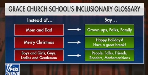 CHILD ABUSE: The Grace Church School in Manhattan recently distributed a 12-page guide detailing its mission of inclusivity. It includes encouraging students and parents to avoid using terms like “mom” and “dad.” Tuition at this K-12, reality-bending bastion of far-left lunacy is $57,000 a year.
