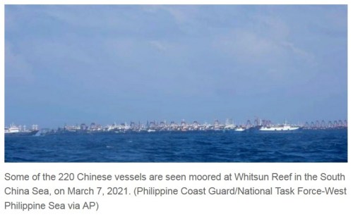 CHICOMS: They have long wanted to control the lucrative South China Sea. Under Trump, they didn’t dare push the issue. Two months after FAUXTUS is inaugurated, there are 220 Chinese war ships tooling around in disputed waters.