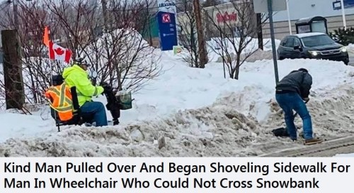 RANDOM ACTS OF KINDNESS: The guy who took the photo above says he was at an intersection in New Minas, Nova Scotia, when he saw a car pull over and a man from inside jump out, get a snow shovel out of his trunk, and run over to clear the sidewalk for the fellow on the mobility scooter.