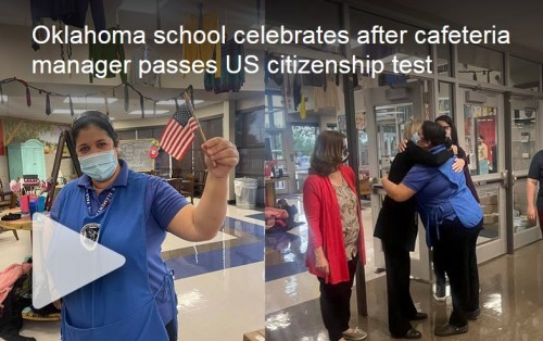 RANDOM ACTS OF KINDNESS: CLICK https://www.facebook.com/fox11la/videos/858542188205319 [1:27] to see the students and staff at an Oklahoma elementary school line the hallways to cheer for their school cafeteria manager who had passed her test to become a U.S. citizen.
