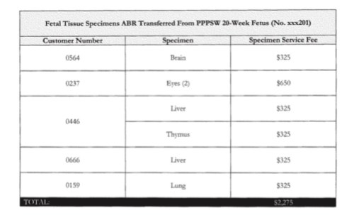 BABY BODY PARTS: A 20-week abortion costs between $1,000 and $2,000. The price chart above shows the body parts harvested from just one such procedure adds more than $2,000 more in profit for the abortuary.