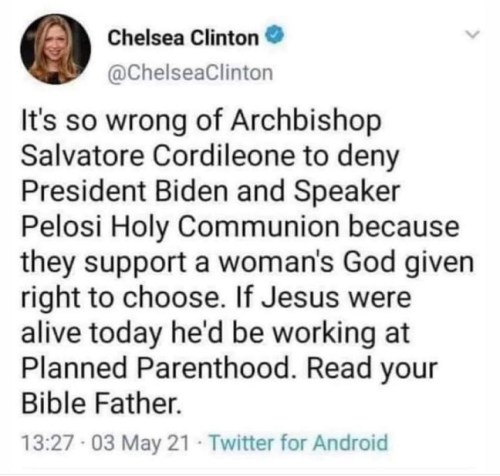 CHELSEA: It is difficult to imagine anyone being so smug and conceited in her ignorance as to sneeringly counsel an archbishop to read his Bible. (BTW, the correct term of address for an archbishop is “Archbishop,” not “Father.”)