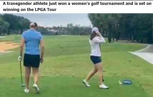 TRANS: She has had all her boy parts cut off and has been taking hormones for years. But nothing can change the fact that her musculature is male. And there’s a reason that the tees for men are behind the tees for women. But, if you think that letting biological males dominate female sports is wrong, shut up.