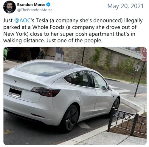 AOC: More elitist hypocrisy. Not only is Whole Foods within walking distance of her apartment, but it even has special parking for elite customers like her. Apparently, that’s not elite enough. She parked in a no parking zone.