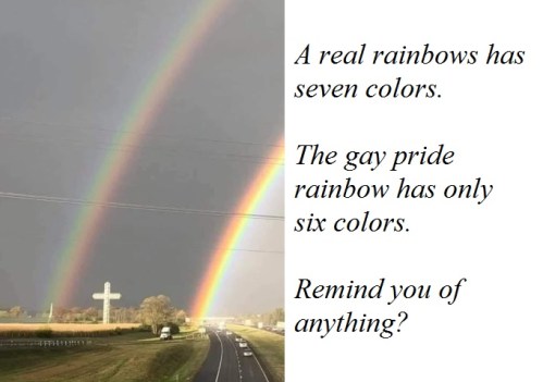 God sent us the natural rainbow as a sign of His everlasting love which we are called to accept in all humility. Satan perverted it in the LGBTQI “pride” flag.