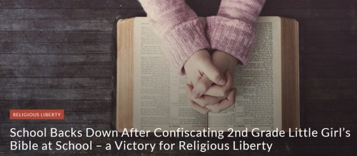 RELIGIOUS LIBERTY: Gabrielle, a second grader in Illinois, liked to bring her Bible to school and read it during recess. A teacher told her “You just can’t be doing that,” and took it away from her. No student nor any parent of any student had complained about Gabrielle’s reading her Bible or had even mentioned it.
