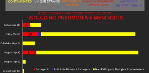 Half of the masks were contaminated with one or more strains of pneumonia-causing bacteria. One-third were contaminated with one or more strains of meningitis-causing bacteria. One-third were contaminated with dangerous, antibiotic-resistant bacterial pathogens. In addition, less dangerous pathogens were identified, including pathogens that can cause fever, ulcers, acne, yeast infections, strep throat, periodontal disease, Rocky Mountain Spotted Fever, and more.