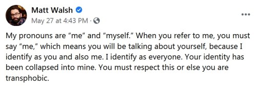 GENDER FLUID: CLICK https://www.facebook.com/MattWalshBlog/videos/507300610482197 [2:48] to hear Michael Knowles’ commentary on a confused young person’s gender. My personal take is the same as it is for all these people who demand we keep track of their neurotic self-identities. But I’m a lady, so I won’t say it out loud.