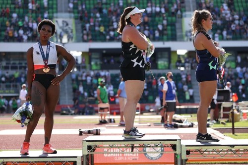 Berry was on the podium, because she had just qualified for her second US Olympic team. Lots of folks are pointing out, quite rightly, that she’s welcome to move to some other country if she doesn’t like representing this one.