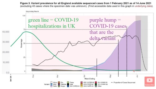 The first and foremost thing everyone needs to understand is that the delta variant is more contagious, but less deadly than the alpha version of the virus that came from Wuhan. In the graph below, you can see that, as the delta variant has taken over in the U.K., it has had no impact on hospitalizations.